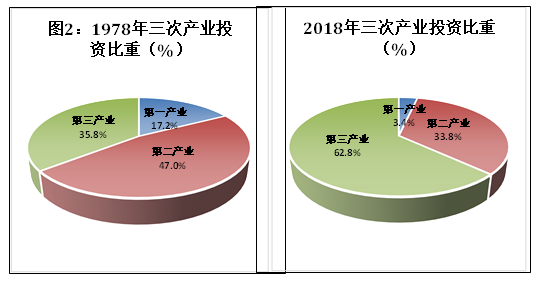 从产业投资结构看,1978-2018年,全省一、二、三次产业分别累计投资7420.36亿元、85667.65亿元和125379.43亿元,一、二、三次产业平均投资结构为3.4:39.2:57.4。其中,1978-1988年,一、二、三次产业分别累计投资103.02亿元、251.61亿元和352.06亿元,平均投资结构为14.6:35.6:49.8。1989-1999年,一、二、三次产业分别累计投资302.02亿元、1452.6亿元和3310.55亿元,平均投资结构为6:28.7:65.3。2000-2018年,一、二、三次产业分别累计投资7015.32亿元、83963.44亿元和121716.82亿元,平均投资结构为3.3:39.5:57.2。全省一、二、三产业投资结构从1978年的17.2:47:35.8调整为2018年的3.4:33.8:62.8,一产业投资占比逐步下降,二产业投资占比先降后升到趋稳,三产业投资占比在波动中持续上升,是全省投资的绝对主体。