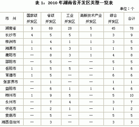 到2010年底,湖南拥有省级及以上开发区78个,分布在全省14个市州,77个县(市、区)。其中国家级开发区9个,比2009年增加3个,主要分布在长沙、株洲、湘潭、岳阳、常德和郴州6市;高新技术开发区5个,分布在长沙、株洲、湘潭、衡阳和益阳5市。