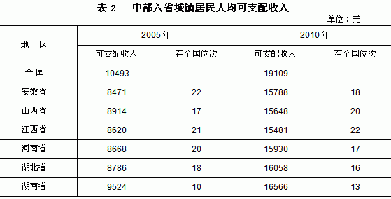 3、居民收入长期低于全国平均水平。由于产业结构、分配模式以及经济效益等方面的影响,湖南城乡居民收入长期低于全国平均水平。2005年湖南城镇居民人均可支配收入比全国平均水平低969元,到2010年,与全国平均水平的差距扩大到2543元,城镇居民人均可支配收入仅为全国平均水平的86.7%,比2005年的90.8%下降了3.1个百分点。2010年湖南城镇居民人均可支配收入绝对额位居中部六省首位,但在全国的排名由2005年的第10位后移到2010年的第 13 位,被辽宁(17713亿元)、内蒙(17698亿元)和广西(17064亿元)赶超。