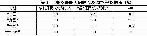 2、居民收入增长慢于GDP增长。经济的持续高速增长不仅使全社会整体财富在不断增长,也使得每个人的财富都有所增加。但全省居民收入与经济增长之间存在一种不匹配现象,主要表现为居民收入增长长期低于经济增长速度。“十一五”时期,湖南省城镇居民可支配收入年均增长8.4%,农村居民人均纯收入年均增长8.8 %,分别比GDP年均增速低5.6、5.2个百分点。