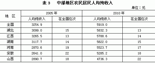 近年来,湖南农村居民人均纯收入虽然保持了平稳较快增长,但和全国比仍然有差距。2005年湖南农村居民人均纯收入比全国平均水平低137.2元,到2010年,与全国平均水平的差距扩大到297元,为全国平均水平的95%,比2005年的95.8%下降了0.8个百分点。从历史数据看,这种差距长期存在且有整体扩大趋势。2010年湖南农村居民人均纯收入绝对额位居中部六省第3位,全国第15位,较2005年下降1位。