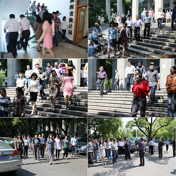 2013年5月13日15时,“呜、呜、呜······”省人防办拉起了地震警报,省统计局全体干部职工从办公室由各个应急通道疏散到安全地带、疏散演练活动组织严密,有条不紊、整个过程不超过5分钟。