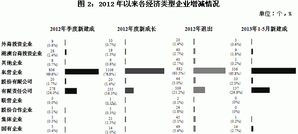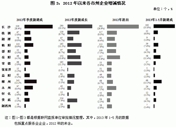 2012年,“三上”企业统计中,新建成1158个,新成长1440个,退出1457个,净增企业1141个。主要特征有:分行业看,工业是“大进大出”,零售业是“多进少出”,批发业是“进退相当”,住宿业和餐饮业是“稳进稳出”,建筑业和房地产业是“进比出少” (见图1)。分经济类型看,私营企业和有限责任公司增减变化活跃,而外资企业呈现净退出状态,值得关注(见图2)。分市州看,新建成企业的分布与经济发展水平基本协同,长沙占近3成,湘南地区占近3成,其余各地占4成多;增减趋势在各地的表现是,新建成的比新成长的数量要少的市州较多,新成长的比退出的数量少的市州也比较多,特别是还有张家界与湘西自治州2个市州为净减少(见图3)。