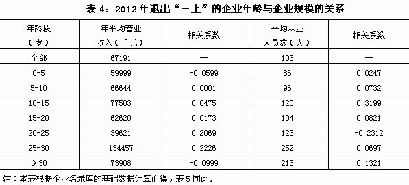 对退出“三上”的企业,将平均年龄与从业人员数、营业收入等反映企业规模的指标进行相关分析后发现,平均从业人员数同企业的年龄存在正相关关系。而与年平均营业收入之间相关分析看,除0—5岁和30岁以上的企业年龄与年平均营业收入为较弱的负相关外,其余各年龄段的企业年龄与年平均营业收入呈偏弱的正相关(见表4)。这表明退出的这些“三上”企业,年龄越大其从业人员越多,当其在少年和青年时期,年龄越大平均营业收入也越大,而在幼年期和中年期以后,年龄越大平均营业收入越小,这应该反映了退出的“三上”企业曾经面临的发展瓶颈和困难。