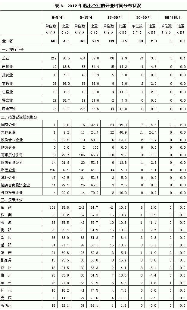 2012年,因关停倒闭或规模萎缩而退出“三上”统计的企业1457个,平均年龄为9.5岁。其中,开业时间在0—5年、5—15年、15—30年、30—60年以及60年以上的企业分别占28.1%、59.9%、9.5%、2.3%、0.1%(见表3),主要分布在幼年期和少年期,说明绝大多数的“三上”企业都处在盛年期以前,成长还很不稳定,比较容易夭折或消亡。分行业看,多数是在青年期以前退出,只有餐饮业在幼年期退出的多于在少年期退出,其余各行业企业在少年期退出的最多。分经济类型看,国有企业和集体企业的年龄明显长于其他类型企业,国有企业和集体企业在青年期退出的最多,随后退出较多的依次是少年期、中年期、幼年期,更可贵的是还有在老年期退出的企业;而其他各类型企业多数是在少年期和幼年期退出,少年期退出的比幼年期对出的多。分市州看,基本上都是在幼年期和少年期退出,并且在少年期退出的明显比在幼年期退出的多。