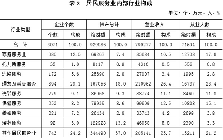 近年来,居民服务业服务领域逐步扩展,从国民经济行业分类看,已经涵盖居民服务业门类中的全部九个行业小类。一是从行业总体规模来看,理发及美容保健服务无论是企业个数、从业人数、营业收入还是固定资产都居各行业之首,是居民服务业的龙头,2013年该行业拥有企业894个,从业人员1.67万人,资产总计16.71亿元,营业收入21.1亿元,分别占到全部居民服务业的29.1%、23.3%、18%、26.4%;其次是洗浴服务,拥有企业279个,从业人员0.85万人,资产总计8.61亿元,营业收入8.88亿元,分别占到全部居民服务业的9.1%、11.9%、9.3%、11.1%。二是从行业发展来看,增长最快的是婚姻服务,2013年营业收入3.37亿元,较2008年增长了193倍;其次是家庭服务,营业收入8.4亿元,增长了306倍。三是伴随着行业结构的优化,服务档次也不断提升。如理发及美容保健服务经营项目已由过去简单的理发、面部护理发展到美发焗油、美甲、面部去皱、身体保健等多种高档次的形式;洗浴服务业经营项目已由过去简陋的池塘、淋浴发展到如今功能齐全、设备先进,提供桑拿、按摩、健身、温泉即各种保健浴等综合休闲娱乐服务;家庭服务业服务形式也已由以往简单的带小孩、做饭、做卫生逐步发展为全职月嫂、陪读托管等。