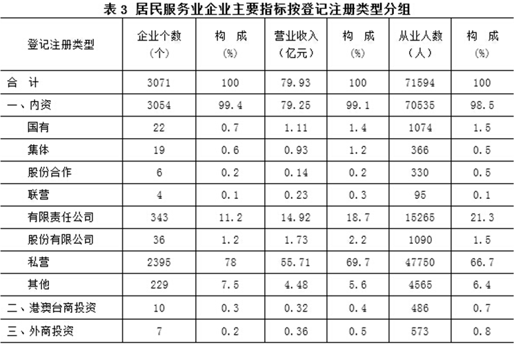 第三次经济普查资料显示:截至2013年,湖南共有居民服务业企业3071家,其中,内资企业3054家,港、澳、台商及外商投资企业17家。从企业数量来看,私营企业比重最高,2013年为2395家,占居民服务业企业总数的78%。从营业收入和从业人数来看,私营企业的主体地位同样突出,2013年私营企业实现营业收入55.71亿元,占居民服务业企业全部营业收入的比重为69.7%;吸纳就业人员4.78人,占居民服务业从业总人数的66.8%。加上居民服务业还有个体户5.05万户,个体从业人员20.19万人,将使得居民服务业中私营经济的成分更多,主体地位更加突出。