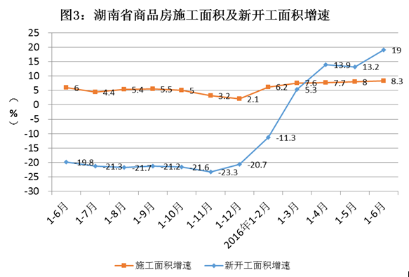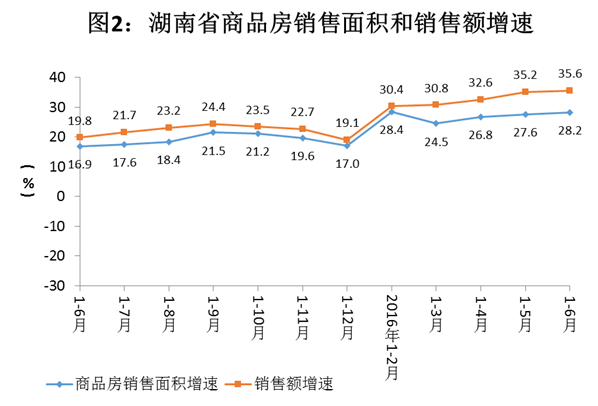 2016年上半年,在房贷政策相对宽松、开发企业促销力度加大等因素共同作用下,湖南房地产市场呈现销售快速回暖、开发投资企稳回升、待售面积增速回落的局面。