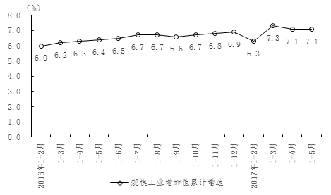 (一)生产运行总体平稳。5月份,全省规模工业实现增加值增长6.8%,增速比4月份提高0.2个百分点,比全国平均水平快0.3个百分点,工业生产总体保持平稳增长。1-5月,全省规模工业累计增长7.1%,增速与1-4月持平,比上年同期快0.7个百分点,比全国平均水平快0.4个百分点,居全国第18位。从发展趋势看,全省规模工业累计增速自2016年1-2月6.0%逐步回升到今年1-5月的7.1%,工业经济稳中向好发展态势明显。