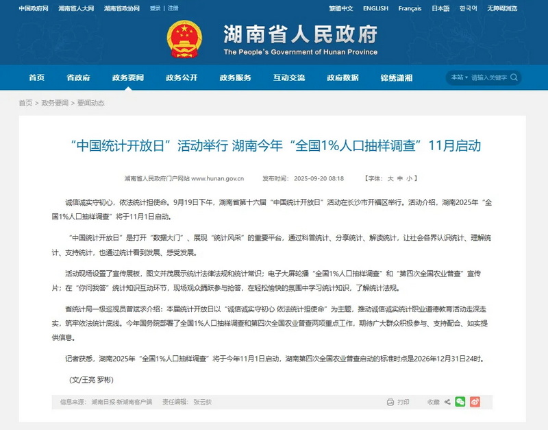 湖南省政府门户网:“中国统计开放日”活动举行 湖南今年“全国1%人口抽样调查”11月启动