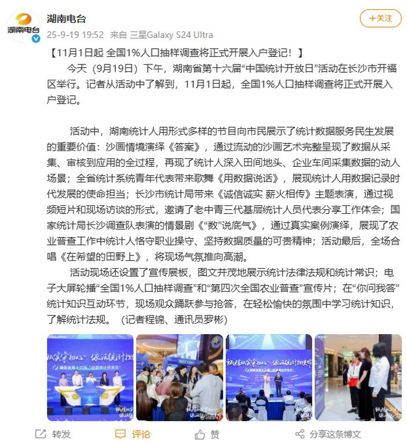 湖南卫视:全国1%人口抽样调查11月起入户登记