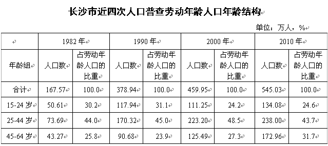 (二)劳动力资源年龄结构老化,未来青壮年劳动力减少。尽管目前长沙劳动力资源是以中青年为主,但从其人口发展趋势来看,如果没有外来青年人口的补充,年龄结构将逐渐老化,主要体现在以下两个方面: