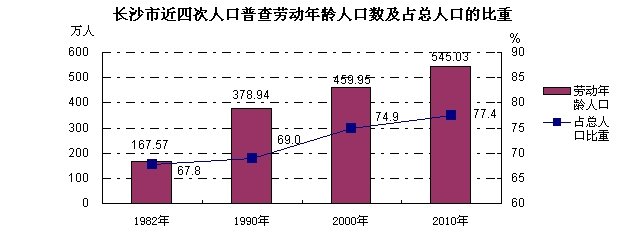 (一)劳动年龄人口总量持续上升。长沙市目前拥有较为充裕的劳动力资源,2010年第六次人口普查显示,长沙市常住人口总数为704.10万人,其中15-64岁的劳动年龄人口545.03万人,占总人口比重的77.4%。从近四次全国人口普查结果来看,近三十年来长沙劳动年龄人口的数量和比重均呈逐年增加的趋势,人数从1982年的167.57万人增长到2010年的545.03万人(包含行政区划调整因素);占全市总人口的比重从1982年的67.8%提高到2010年的77.4%。根据第六次人普的人口结构推算,2013年长沙劳动年龄人口554万人左右,比2010年增加9万人;其比重略有波动,比2010年下降0.6个百分点。