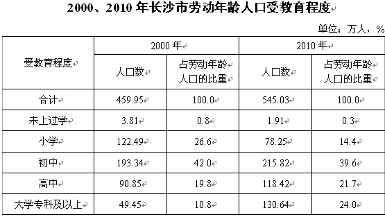 (五)劳动年龄人口受教育程度明显提高。从近两次人口普查结果来看,劳动年龄人口受教育程度明显提高。主要表现为:一是文盲人口大幅度下降。2010年长沙劳动年龄人口中的文盲人口为1.91万人,占劳动年龄人口的比重为0.3%,比全省1.3%的平均水平低1个百分点。与2000年相比,文盲人口减半,所占比重下降0.5个百分点。二是劳动年龄人口的受教育程度结构进一步优化。小学文化程度的人口比重由2000年的26.6%降至2010年的14.4%,降低了12.2个百分点;初中及以上文化的人口比重由2000年的72.6%升至2010年的85.3%,提高了12.7个百分点,特别是大学专科及以上文化的劳动年龄人口比重由2000年的10.8%升至2010年的24.0%,提高了13.2个百分点。三是人均受教育年限不断提高,2010年长沙市劳动年龄人口平均受教育年限为10.87年,相当于高二水平,比2000年的9.47年提高1.40年,其文化程度实现了从初中向高中的转变,文化素质迈上新台阶。据推算,2013年长沙市人均受教育程度已达高中三年级水平。