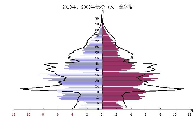 二是从长沙劳动年龄人口中各年龄段比重看,低年龄段比重下降,高年龄段比重上升。2010年15-24岁的劳动人口134.08万人,占劳动年龄人口的比重由1982年的30.2%下降到24.6%,受国家计生政策影响,其中主要是15-19岁的低龄人口比重下降较快,由1982年的18.7%下降到2010年的8.1%,降低了10.6个百分点,“十二五”之后将对需要青年劳动力较多的行业造成一定的影响。高年龄段45-64岁的劳动人口比重由1982年的25.8%提高到2010年的31.7%,提高了5.9个百分点,劳动力资源明显老化。25-44岁年龄段劳动力比重最大,2010年占43.7%,“十二五”后将逐年加剧长沙劳动年龄人口老化的程度。下图是以单岁组分性别人口占总人口的比例绘制的2000年(阴影)和2010年(曲线)人口金字塔的合影,纵坐标表示年龄,男性位于中轴线左边,女性位于右边。可以形象明确地看出,2000-2010年长沙劳动年龄人口的性别、年龄状况和发展变动趋势,金字塔的上半部逐渐扩大,老化趋向明显;下半部逐渐缩小,未来青壮年劳动力呈减少趋势。