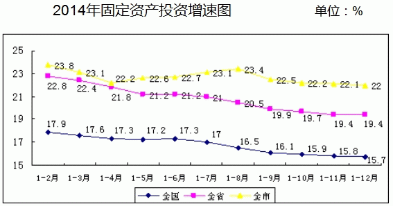 受大环境影响,2014年株洲市固定资产投资走势和全国、全省一致,总体呈现回落态势。年初以23.8%的速度开局,最终全年完成固定资产投资1837.1亿元,增长22%,分别高于全国、全省6.3、2.6个百分点,总量位居全省第2位,速度位列全省第6位。