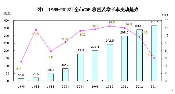 一是经济发展实现了由小步慢走到阔步前进的跨越。沐浴改革开放的春风,唤醒了具有世界绝版旅游资源的张家界。1988年,国务院批准设立地级大庸市,1994年更名为张家界市。20多年来的艰苦创业,张家界的经济社会地位发生了根本性巨变。全市地区生产总值(GDP)由1990年的15.3亿元增加到2013年的365.65亿元,其中2007、2010年分别创建市以来最高增速14.6%和14.5%,2005年全市GDP达到107.70亿元,首次迈过百亿元大关,2009年突破两百亿达到203.1亿元,2012年突破三百亿达338.98亿元。
