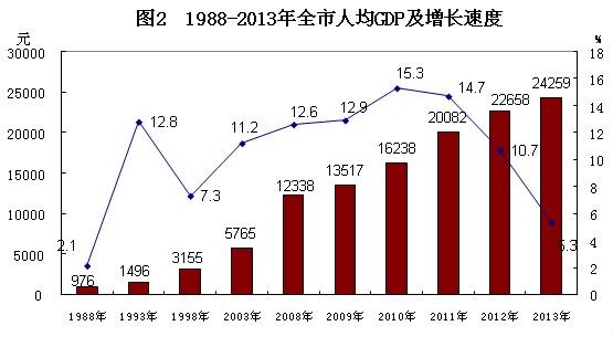 地区生产总值在逐步增大的同时,人均GDP水平也得到同步提升。建市之初,传统农业是张家界的主体产业,年人均生产总值仅有976元,而随着“旅游立市,旅游强市”发展决策的深入推进,全市经济结构不断发生裂变,旅游业成为推动全市经济发展的主导产业。1988-2013年,全市人均GDP由976元增加到24259元,总量增长近25倍,年均增长13.7%