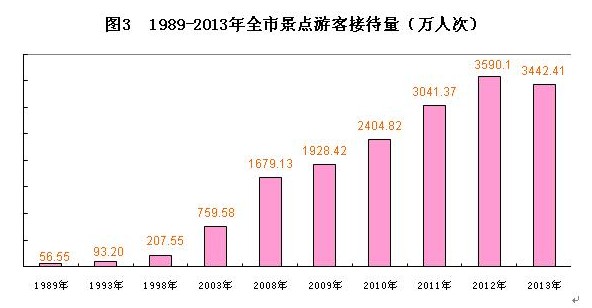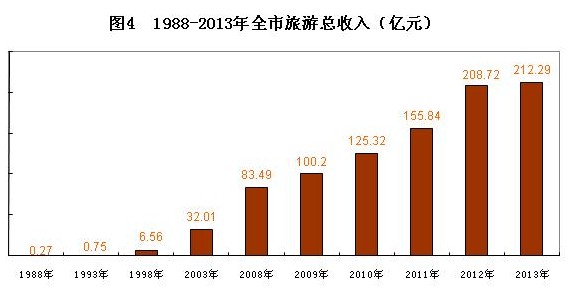1989-2013年,全市景点游客接待量由56.55万人增加到3442.41万人,人数总量增长了60倍,年均增长18.7%。伴随着游客接待量的节节攀升,旅游总收入也同步增长。1988-2013年,全市旅游总收入由0.27亿元增加到212.3亿元,旅游总收入增长790倍,年均增长达到30.6%。