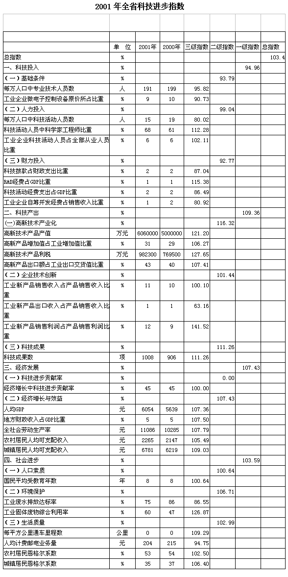 2001年科技进步统计监测从科技投入、科技产出、科技促进经济发展和社会进步4大领域和科研基础条件、人力投入、财力投入、高新技术产业化、企业技术创新、经济增长与效益、人口素质、生活质量等12个方面,省级以纵向对比、市州以横向对比进行综合评价。结果显示:全省科技进步综合指数103.4,比上年提高3.4个百分点。其中:科技投入指数28.5,使全省科技进步综合指数负增长1.5个百分点;科技产出指数32.8,为科技进步综合指数贡献2.8个百分点,贡献率达到82.4%;科技促进经济发展指数21.5,为科技进步综合指数贡献1.5个百分点,贡献率为44.1%;科技促进社会进步指数20.7,为科技进步综合指数贡献0.7个百分点,贡献率为20.6%。