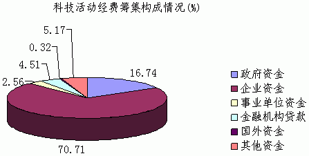 2005年,全省科技活动经费筹集额为108.51亿元,增长12.66%,其中政府资金18.16亿元,增长9.2%,企业资金76.72亿元,事业单位资金2.77亿元,金融机构贷款4.89亿元,国外资金0.35亿元,其他资金5.61亿元。