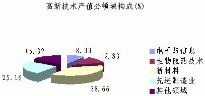 2005年共完成高新技术产业产值1521.97亿元,比上年增长22.3%;高新技术产业增加值472.93亿元,增长21.8%;实现高新技术产业销售收入1521.68亿元,增长20%,其中出口收入19.15亿美元,增长28.8%;实现高新技术产业利税162.09亿元,增长5.2%。高新技术产业增加值对GDP的贡献率达到9.73%,拉动全省经济增长1.13个百分点,比上年提高0.09个百分点。全省基本形成以新材料、先进制造业、生物医药和电子信息技术四大高新领域为主体的高新技术产业体系。全年四大高新技术领域共实现高新技术产值1293.36亿元,占全省高新技术产值的84.98%,比上年提高2.32个百分点。其中,新材料领域588.36亿元,占全省的38.66%;先进制造业382.92亿元,占全省的25.16%;电子信息领域126.76亿元,占全省的8.33%,生物医药领域195.33亿元,占全省的12.83%。