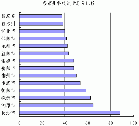 (一)以长株潭为核心的“一点一线”地区科技进步好于其他地区。科技进步总分的前7名中,“一点一线”地区的占了6个,长沙、湘潭、株洲、衡阳分列前4名,郴州和岳阳分别排在第6名和第7名。其中长沙作为全省的政治、经济、文化中心,又是科研院所和高等院校较集中的城市,在科技投入、科技产出、科技促进经济增长和科技促进社会进步4个方面均处于全省第一。因此,长沙在各市州科技进步总分排名中也雄踞榜首。