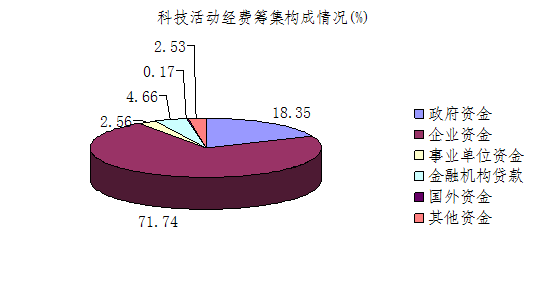 2006年,全省科技活动经费筹集额为133.70亿元,比上年增长23.2%,其中政府资金24.54亿元,增长35.1%,企业资金95.91亿元,事业单位资金3.42亿元,金融机构贷款6.23亿元,国外资金0.22亿元,其他资金3.38亿元。