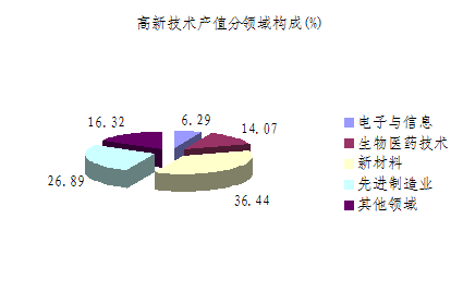 2006年共完成高新技术产业产值1893.18亿元,比上年增长24.4%;高新技术产业增加值597.49亿元,增长26.3%;实现高新技术产业销售收入1909.29亿元,增长25.5%,其中出口收入28.23亿美元,增长47.4%;实现高新技术产业利税192.50亿元,增长18.8%。高新技术产业增加值对GDP的增长贡献率达到11.78%,拉动全省经济增长1.44个百分点,比上年提高0.31个百分点。全省基本形成以新材料、先进制造业、生物医药和电子信息技术四大高新领域为主体的高新技术产业体系。全年四大高新技术领域共实现高新技术产值1584.31亿元,占全省高新技术产值的83.68%。其中,新材料领域689.84亿元,占36.44%;先进制造业509.02亿元,占26.89%;生物医药领域266.37亿元,占全省的14.07%;电子信息领域119.07亿元,占6.29%。