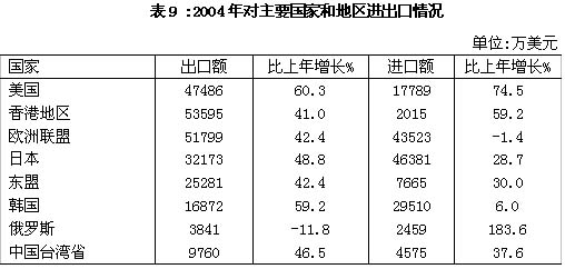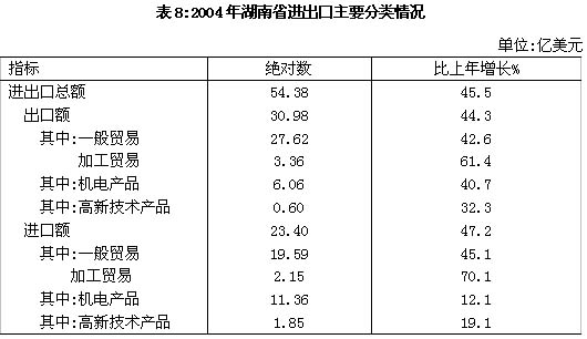 对外贸易取得新突破。2004年,全省进出口总额为54.38亿美元,比上年增长45.5%,其中出口30.98亿美元,增长44.3%;进口23.40亿美元,增长47.2%。一般贸易进出口额为47.21亿美元,增长43.6%;加工贸易进出口额5.50亿美元,增长64.7%。按企业性质分,国有企业进出口31.32亿美元,增长37.5%;集体企业2.83亿美元,增长17.4%;私营企业9.52亿美元,增长111.9%;外商投资企业10.70亿美元,增长39.2%。对欧盟、日本、美国、香港、东盟等主要贸易伙伴的出口快速增长。出口商品中,农产品出口2.3亿美元,增长24.0%;机电产品出口6.06亿美元,增长40.7%。