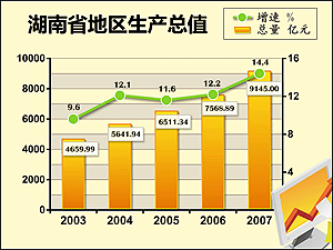区域经济保持协调发展。优势地区辐射带动作用增强。长株潭三市生产总值3461.78亿元,比上年增长15.7%,比全省快1.3个百分点;“3+5”地区生产总值6923.58亿元,增长15.3%,比全省快0.9个百分点。大湘西地区开发初见成效,实现生产总值998.86亿元,比上年增长13.3%,加快1.7个百分点。新型城市化稳步推进,全省城镇化率40.45%,比上年提高1.74个百分点。
