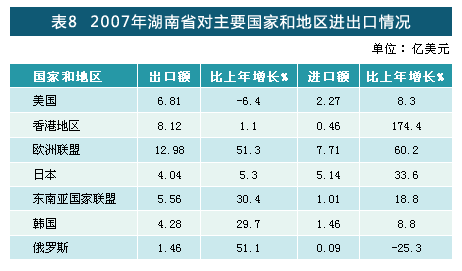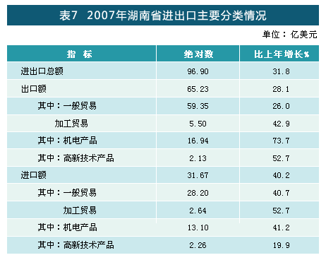 进出口总额继续增长。全省进出口总额96.90亿美元,比上年增长31.8%。其中,出口65.23亿美元,增长28.1%;进口31.67亿美元,增长40.2%。一般贸易进出口87.55亿美元,增长30.4%;加工贸易进出口8.14亿美元,增长46.0%。私营企业进出口35.90亿美元,比上年增长81.1%,加快28.3个百分点。机电产品出口16.94亿美元,比上年增长73.7%,加快43.3个百分点;高新技术产品出口2.13亿美元,增长52.7%。农产品出口3.5亿美元,增长12.4%。其中,活猪出口0.53亿美元,增长14.7%;茶叶出口0.40亿美元,增长19.2%。
