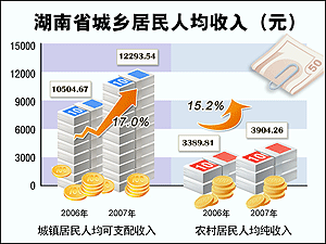 居民收入大幅增长。全省城镇居民人均可支配收入12293.54元,比上年增长17.0%,扣除价格因素,实际增长11.2%,加快2.6个百分点,增幅为1996年以来最高水平。其中,人均工薪收入7975.14元,增长16.7%,加快8个百分点;经营净收入1192.42元,增长10.0%,加快3.4个百分点;转移性收入2955.07元,增长20.4%,加快7.3个百分点;财产性收入170.91元,增长28.4%。最低收入户人均可支配收入4455.18元,增长26.9%;最高收入户与最低收入户的人均收入比由上年的8.02:1缩小为7.31:1。农村居民人均纯收入3904.26元,增长15.2%,扣除价格因素,实际增长8.3%。其中,工资性收入1712.31元,增长18.1%;家庭经营收入1963.91元,增长12.6%;转移性和财产性收入228.04元,增长16.0%。