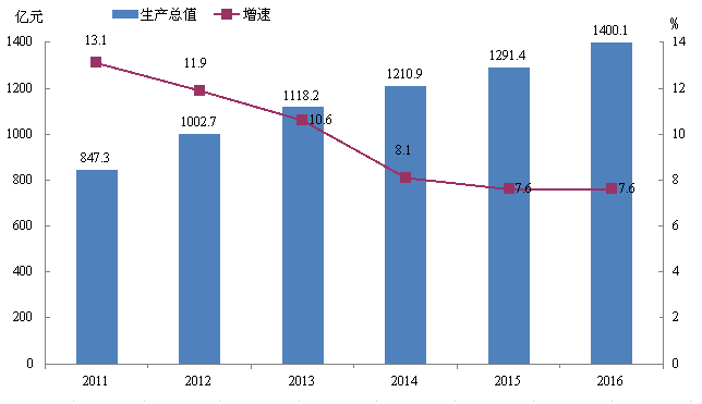 图1、2011-2016年全市地区生产总值及增长速度