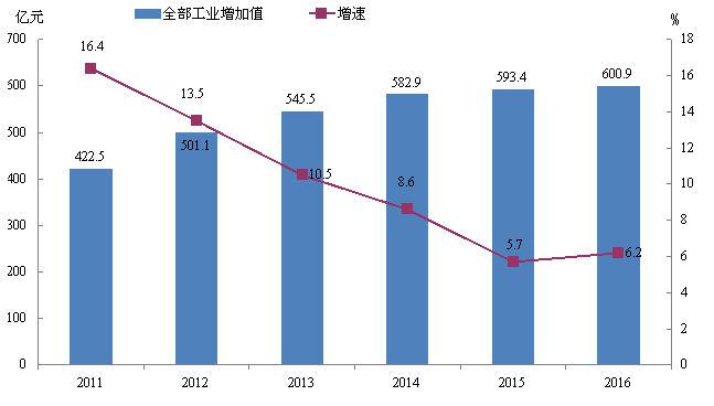 图4:2011-2016年全市工业增加值及增长速度