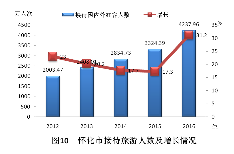 深入实施生态文化旅游“1354”工程,怀化入列全国全域旅游创建示范区。全年建成国家4A级景区2个、3A级景区8个。全市国家等级旅游景区(点)增加至40个,其中,4A级景区(点)7个,3A级景区30个,2A级景区3个。全市拥有星级饭店40家,其中四星级1家,三星级30家,二星级9家。全年实现旅游总收入297.44亿元、增长31.2%。全年共接待国内旅游人数4237.96万人次、增长27.8%,国内旅游收入295.71亿元、增长31.2%,境外入境旅游人数9.22万人次、增长14.5%。