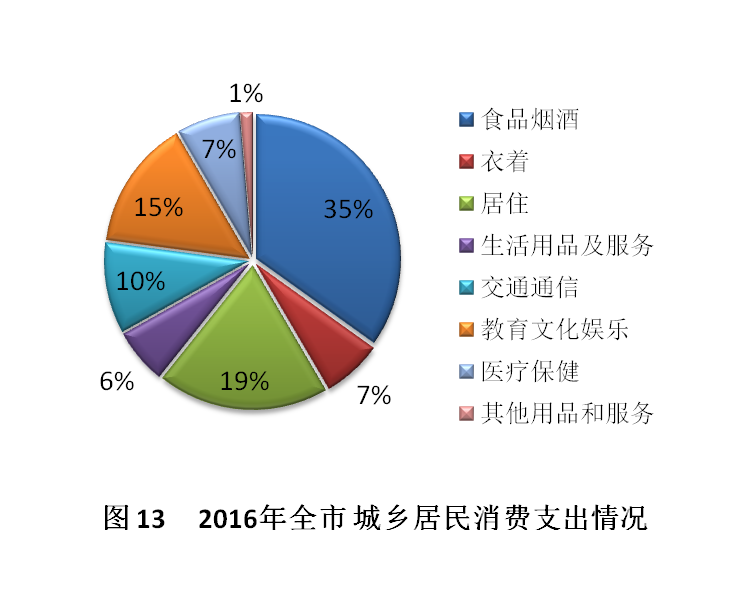 全市居民人均消费支出10853元。其中,食品烟酒消费支出3785元,衣着消费支出726元,居住消费支行2084元,生活用品及服务消费支出669元,交通通信消费支出1102元,教育文化娱乐消费支出1571元,医疗保健消费支出769元,其他用品和服务支出147元。