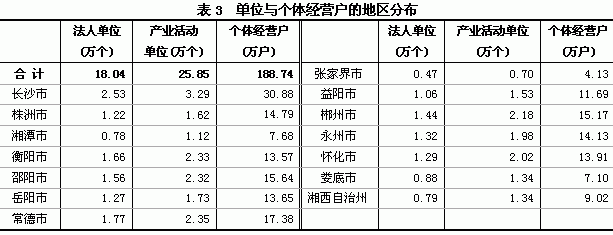 分市州看,拥有法人单位数和产业活动单位数名列全省前5位的依次是:长沙市、常德市、衡阳市、邵阳市、郴州市,5市共有法人单位8.96万家和产业活动单位12.47万家,分别占全部法人的49.7%和48.2%。
