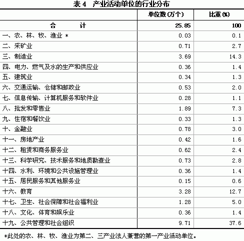在产业活动单位中,从事制造业的单位3.69万个,占14.3%;批发和零售业1.89万个,占7.3%;教育3.28万个,占12.7%;公共管理和社会组织9.71万个,占37.6%。4个行业合计占71.9%(详见表4)。