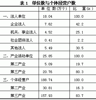 2004年末,全省共有从事第二、三产业的法人单位18.04万个。其中,企业法人单位7.62万个,机关、事业法人单位4.52万个,社会团体法人单位0.41万个,其他法人单位5.49万个。产业活动单位25.85万个,其中,第二产业5.09万个,第三产业20.76万个。个体经营户188.74万户,其中,第二产业30.81万户,第三产业157.93万户(详见表1)。