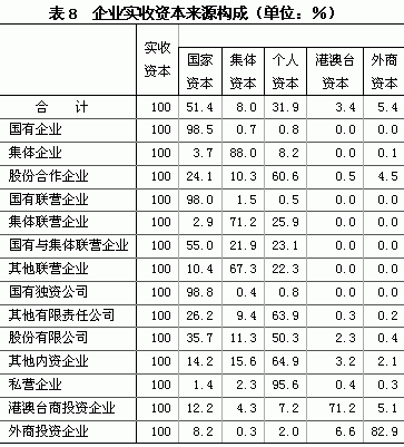2004年末,全省第二、三产业7.62万个企业法人单位的实收资本[4]总额为3510.57亿元。在全部企业法人单位的实收资本总额中,由国家投入的资本1803.23亿元,占51.4%;集体投入的资本281.11亿元,占8.0%;个人投入的资本1118.29亿元,占31.9%;港澳台投入的资本119.54亿元,占3.4%;外商投入的资本188.40亿元,占5.4%(详见表8)。