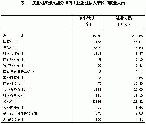 在工业企业法人单位就业人员中,国有企业及国有独资公司占19.8%;集体企业占10.5%;私营企业占46.1%;港、澳、台商投资企业占2.6%;外商投资企业占1.8%;其余类型企业占19.2%(详见表1)。