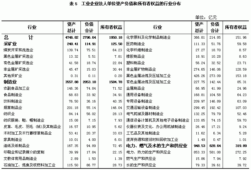 2004年末,工业企业法人单位资产合计4746.82亿元,负债合计2796.64亿元,所有者权益 [2] 合计1950.18亿元。