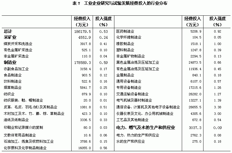 分行业看,研究与试验发展经费投入超过1亿元的行业有7个:通信设备、计算机及其他电子设备制造业,交通运输设备制造业,黑色金属冶炼及压延加工业,专用设备制造业,化学原料及化学制品制造业,电气机械及器材制造业,有色金属冶炼及压延加工业。投入强度在1%以上的行业有5个:通信设备、计算机及其他电子设备制造业,仪器仪表及文化、办公用机械制造业,电气机械及器材制造业,交通运输设备制造业,专用设备制造业(详见表7)。