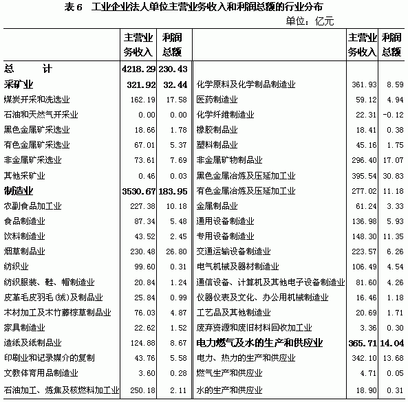 工业企业法人单位利润总额230.43亿元,其中,采矿业占14.1%,制造业占79.8%,电力、燃气及水的生产和供应业占6.1%。利润总额超过10亿元的行业有8个:黑色金属冶炼及压延加工业、烟草制品业、煤炭开采和洗选业、非金属矿物制品业、电力、热力的生产和供应业、专用设备制造业、有色金属冶炼及压延加工业、农副食品加工业(详见表6)。