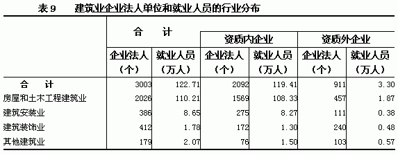 2004 年末,我省共有建筑业法人企业单位3003个,就业人员122.71万人;建筑业个体经营户3.05万户,就业人员20.21 万人。