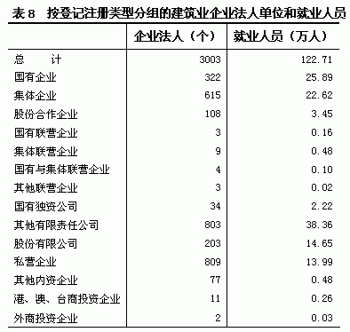 建筑业企业法人单位中,国有企业及国有独资公司 356个,占11.8 %;集体企业 615个,占20.5 %;私营企业809个,占26.9 %;港、澳、台商投资企业11个,占 0.4 %;外商投资企业2个,占 0.1%。其余类型企业1210个,占40.3%。