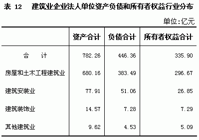 2004 年末,我省建筑业企业的资产合计为782.26亿元,负债合计为 446.36亿元。企业所有者权益合计为335.90亿元,建筑业企业法人单位资产负债率为 57.1%(详见表12)。