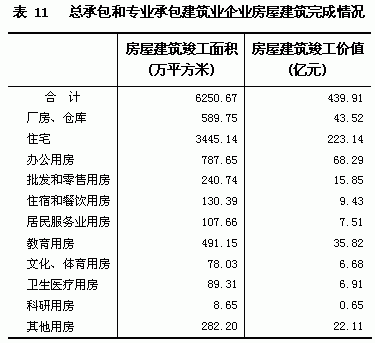 2004年,总承包和专业承包建筑业企业[8]房屋建筑施工面积12522.96万平方米,房屋建筑竣工面积 6250.67万平方米,竣工价值439.91亿元。按用途分房屋建筑完成情况(详见表11)。
