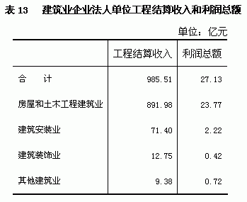 2004年,我省建筑业企业法人单位工程结算收入985.51亿元,其中,房屋和土木工程建筑业占90.5 %,建筑安装业占7.2%,建筑装饰业占1.3 %,其他建筑业占1%;利润总额 27.13亿元,其中,房屋和土木工程建筑业占 87.6%,建筑安装业占8.2%,建筑装饰业占1.6%,其他建筑业占2.6%(详见表13)。